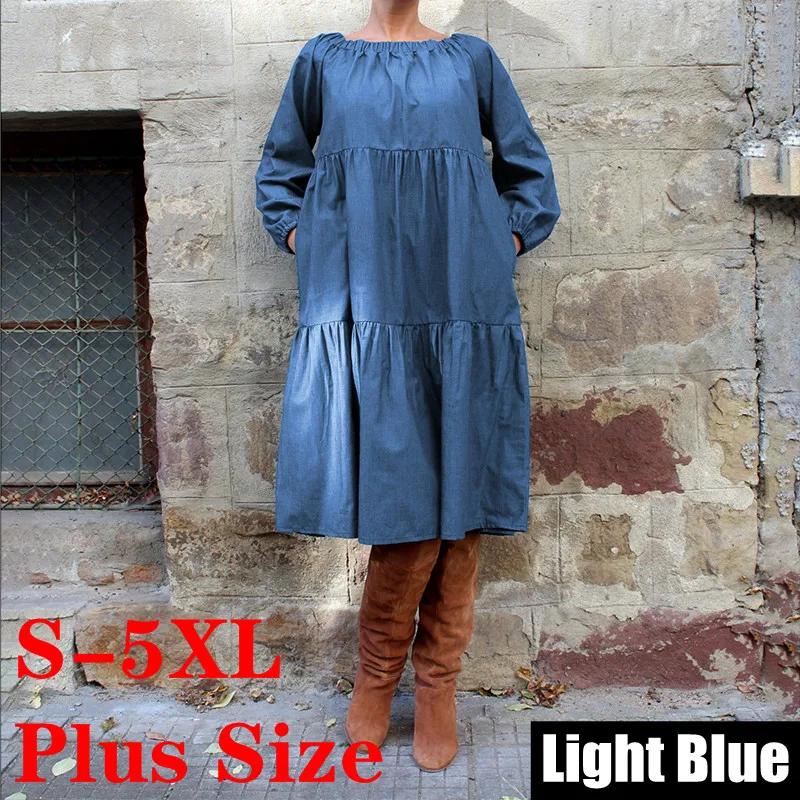 New Product Plus Size Denim Dress 2019 Autumn Bohemian Women Long Lantern Sleeve Knee-Length Dress Casual Vesti