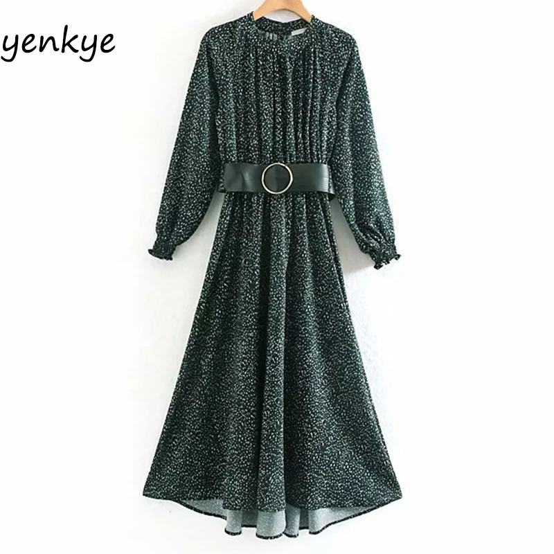 Flash Sale Women Vintage Floral Print Long Dress Long Sleeve Round Neck With Belt Asymmetric Hem A-line Casual